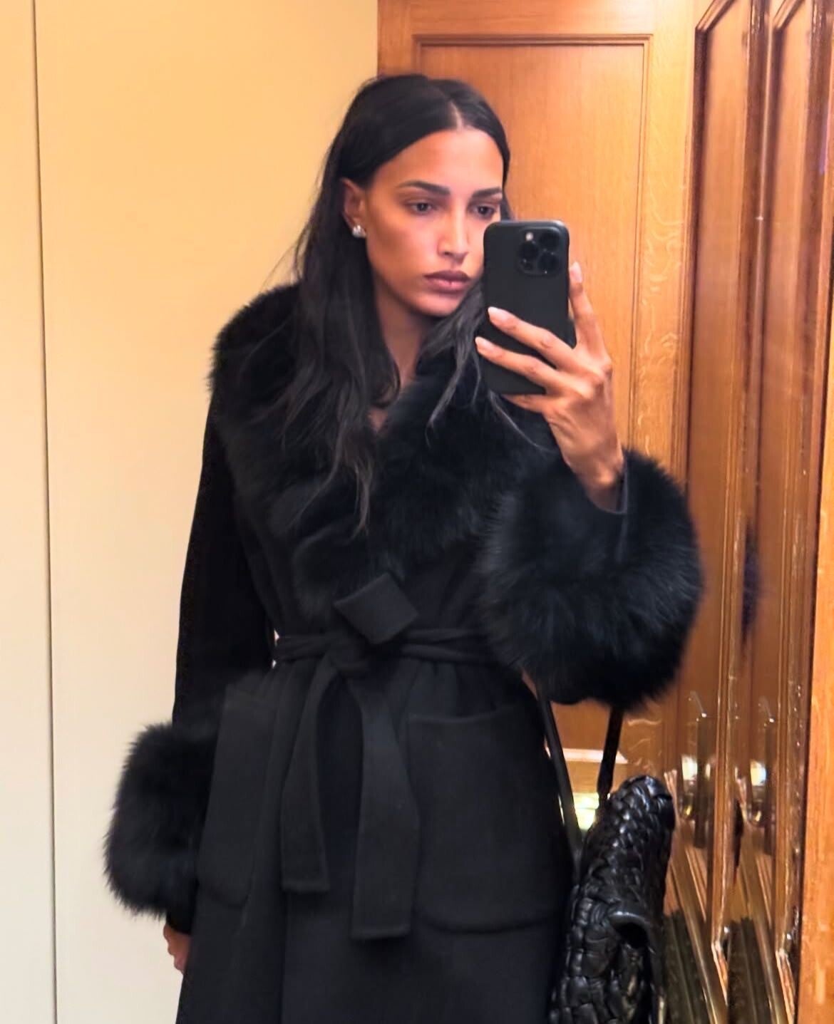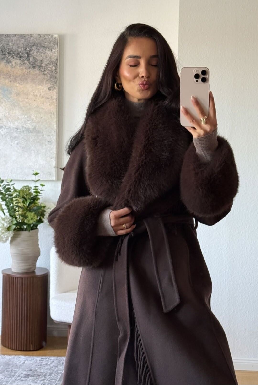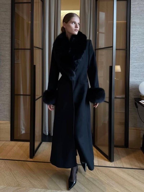 Ζεστό μάλλινο παλτό μακρύ με επένδυση οικολογικής γούνας στον γιακά και τα μανίκια.